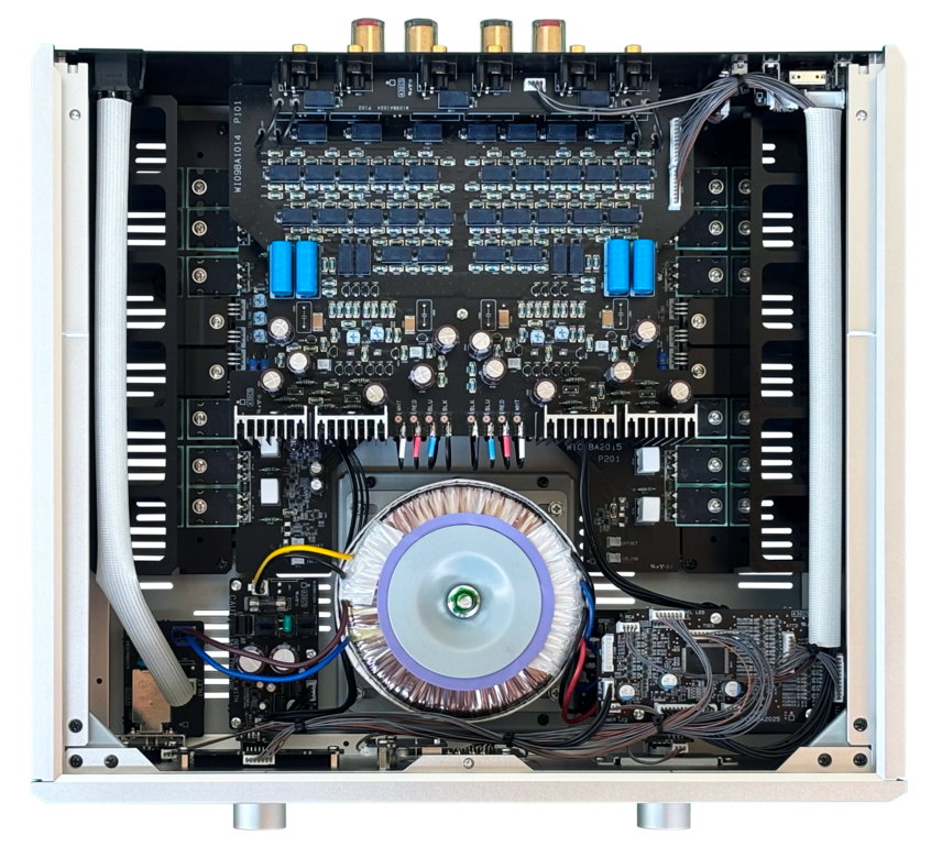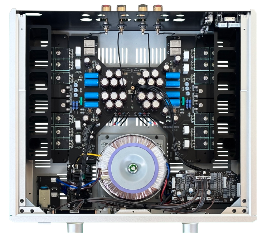 The high-current loop – “rectifier capacitor → output transistor → loudspeaker plus terminals → loudspeaker minus terminals → rectifier capacitor “– is minimized. Eliminating inductance components in the high-current lines creates exceptional frequency response and stability.