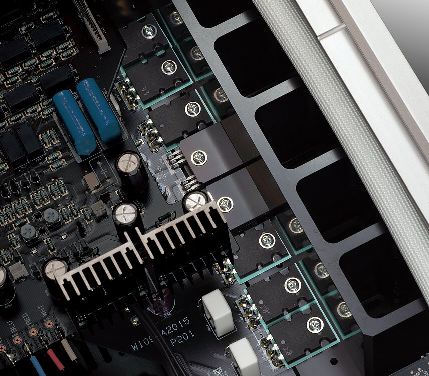 Composed of the output stage and the main power supply, the power block features an inner layer of 70-micron thick copper foil substrate inner layer plane as the power supply busbar.