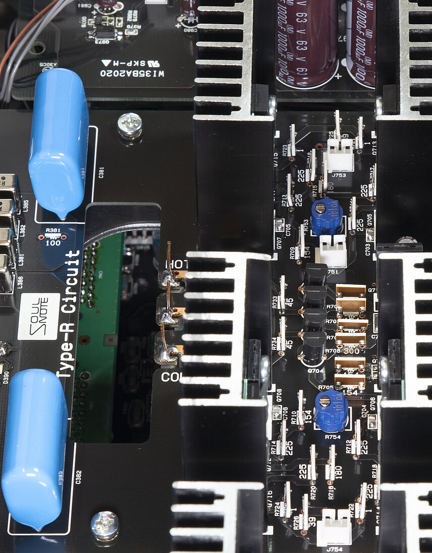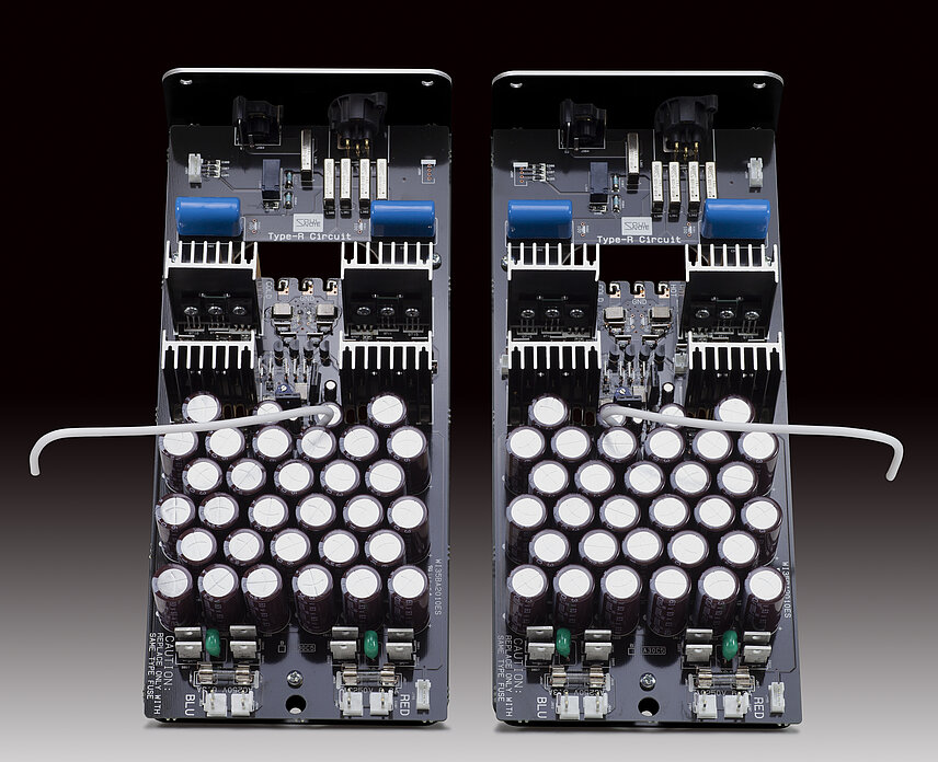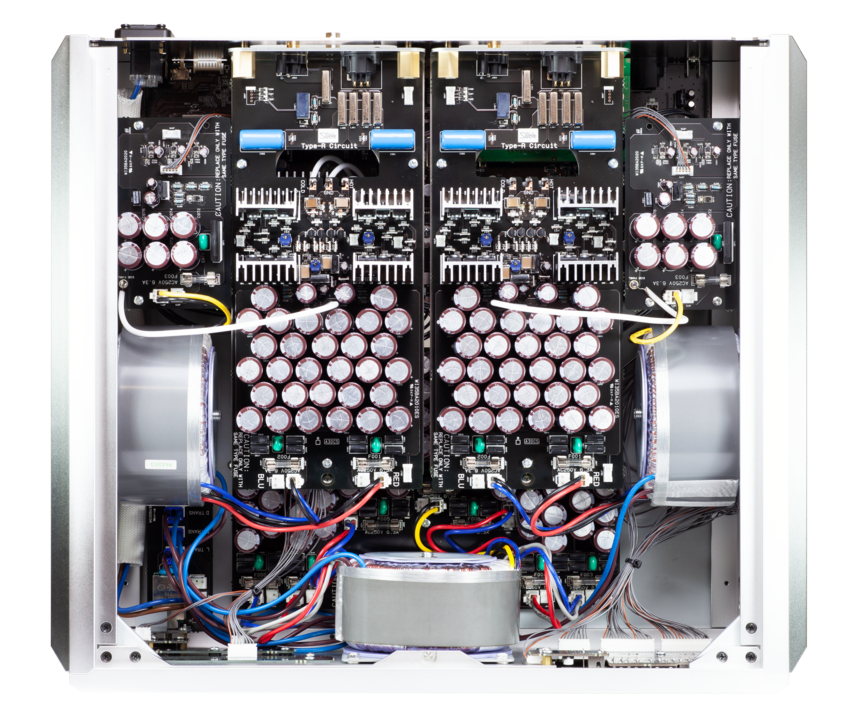 The D-3 adopts a dual monaural construction that employs two identical and dedicated sets of terminals, Type-R circuits, power supply channels, power transformers, relay drive circuitry, and relay power supplies for the left and right channels. It is also fully separated from the digital power supply, including the transformer. A photocoupler completely separates the relay control signals that connect with the analog signal system. The mounting base for the aluminium circuit board is not fixed, laying the foundation for uninhibited and more impassioned sound quality. Analog circuit boards are mounted on independent right and left circuit board chassis and are also independent from the rear panel connectors. Similar to the P-3, foaming Teflon-covered cables connect the left and right independent side aluminium ground anchors to the respective aluminium ground anchors that are isolated from the chassis.