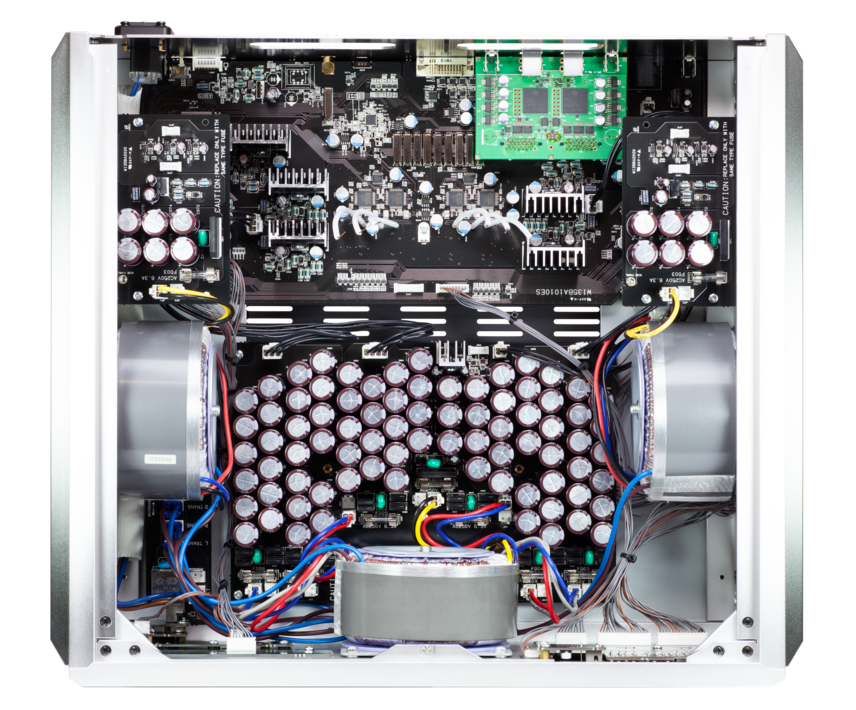 The power transformer with copper short ring is divided into independent transformers – digital and analog – with each section mounted independently on the side of an aluminium base that convey any transformer vibrations from each base to a grounding spike. Each of the transformers is mounted vertically in parallel with the circuit board to prevent possible noise interference in the circuits caused by leakage flux. A vital component of sound quality, the transformer base’s sandwich structure features an aluminium side floated at three points by titanium spacers and employs optimum materials, structure, and shape to eliminate resonance and avoid dumps. The 152 low-magnification electrolytic capacitors in the rectifier capacitor and 52 ultra high-speed SiC diodes in the rectifier diode demonstrate our unwavering dedication to sound quality. They constitute the core of this massive power supply.