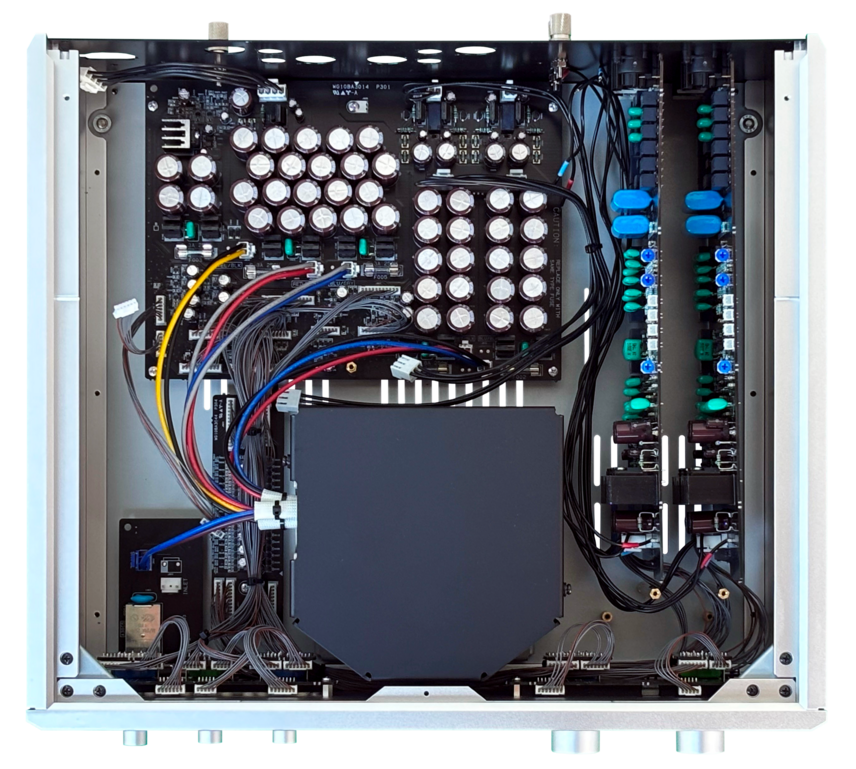 An extremely powerful 400VA bifilar-wound transformer is deliberately used in a single-ended configuration. This approach clarifies the GND and power supply potential. The combination of numerous capacitors of small-capacity connected in parallel and a high-speed non-NFB regulator results in dedicate playback that even recreates the air movement rising from the stage while forming precise sound images.