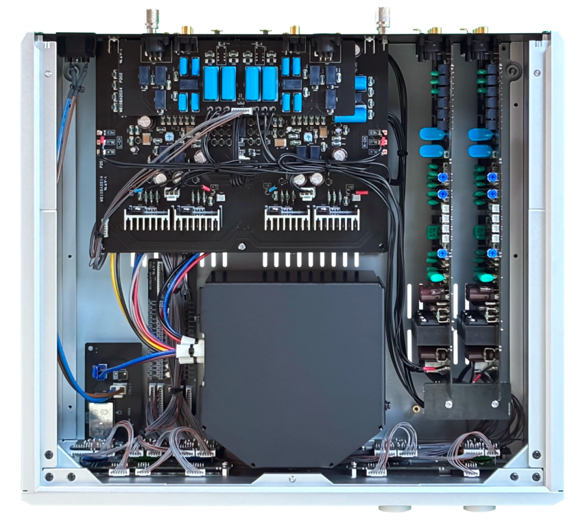 This circuit eliminates the shortcomings of conventional NF and CR types by incorporating precise RIAA characteristics directly into the differential amplifier gain itself. Each channel operates independently on its own circuit board, forming a twin-mono configuration. This enables precise and expansive spatial imaging. The bias circuit for both MC and MM circuit has been completely refined and simplified.