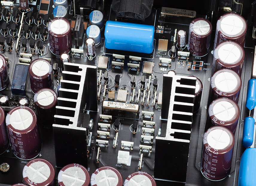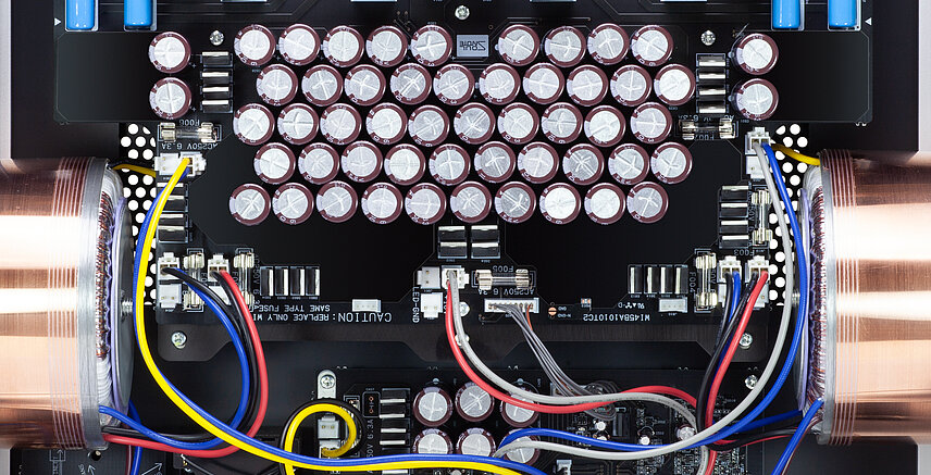 For the rectifying capacitor, a specially selected high withstand voltage small capacitance low magnification foil filter capacitor is used. To optimize the capacity, the number of units used was determined and the load on the power transformer was reduced. This further improved the real regulation of the ultra-powerful power transformer. For the rectifier diodes, SiC diodes of the latest specifications with enhanced allowable inrush current are used. This is the most powerful and high-speed power supply configuration ever considered. In addition, two large power relays with excellent sound quality are used independently and without fixing as power switches for the two main power transformer. In other words, the power switch on the front panel is dedicated to the control system sub-transformer. Independent power switch for each power transformer, which is a high current contact point, is very effective in terms of sound quality.