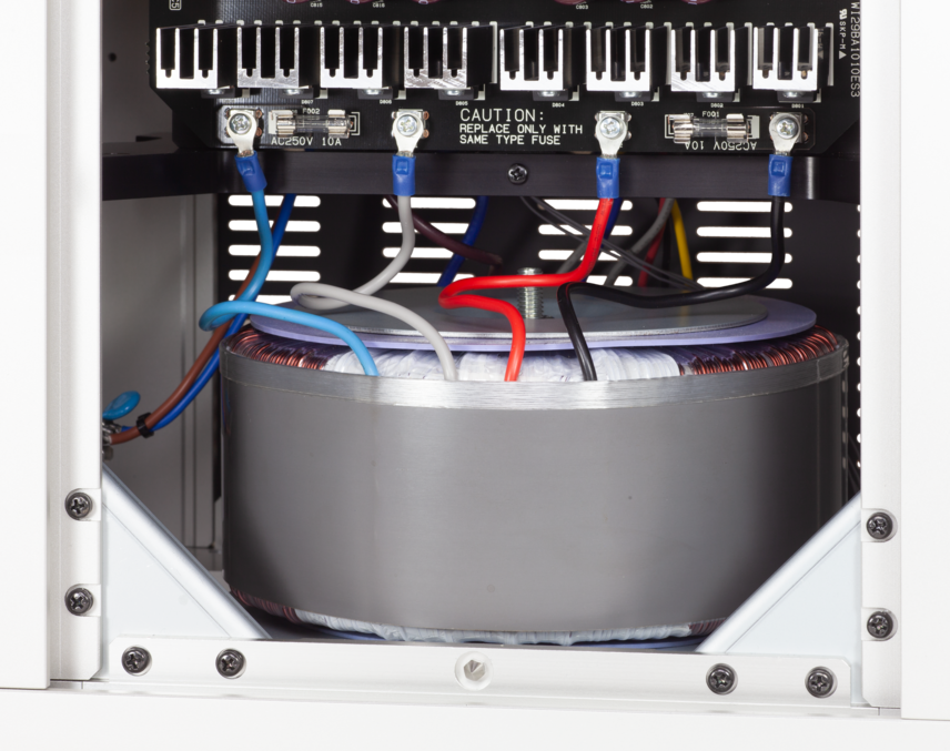 We developed a large power transformer that can be carried by one person alone. This giant power transformer is mounted vertically to the front panel so that any leakage flux travels parallel to the circuit boards, and it is suspended on titanium washers and connected to a spike to ensure that harmful vibrations are not transmitted to the chassis.