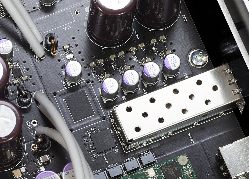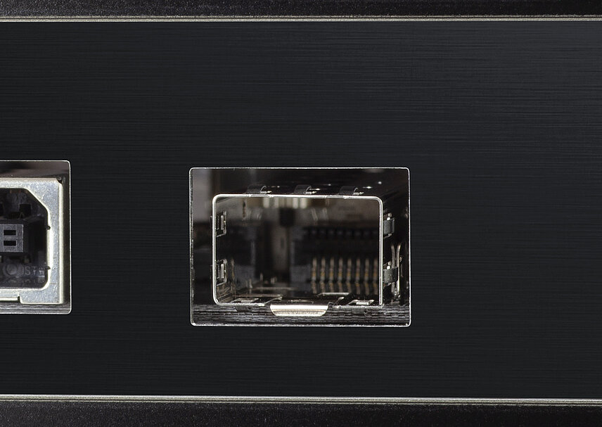 By incorporating an optical link module, this opens up the door to optical cable connections. Besides the use of an SFP RJ45 module allows for compatibility with regular LAN cable connections.