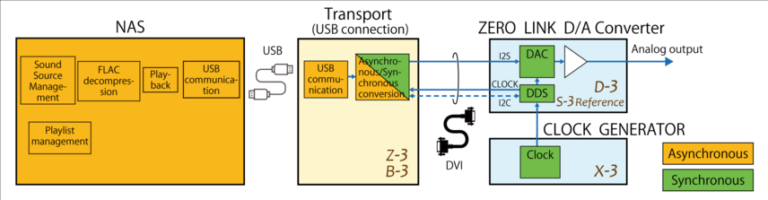 ZERO LINK not only sends Master clock signals and I2S signals, but also interactively communicates between Transport and D/A converter. That is, the transport transmits the format of the sound source to the D/A converter before playback first, and the DDS of the D/A converter generates a high-grade master clock synchronized to this format and sends it back to the transport. Then the transport generates a pure I2S signal synchronized to that master clock and sends it to the D/A converter again. As a result, ZERO LINK enables DAC and Transport completely synchronized with Master clock generated by DAC, and as a result enables completely leaving out synchronous circuits that can cause sound quality deterioration.